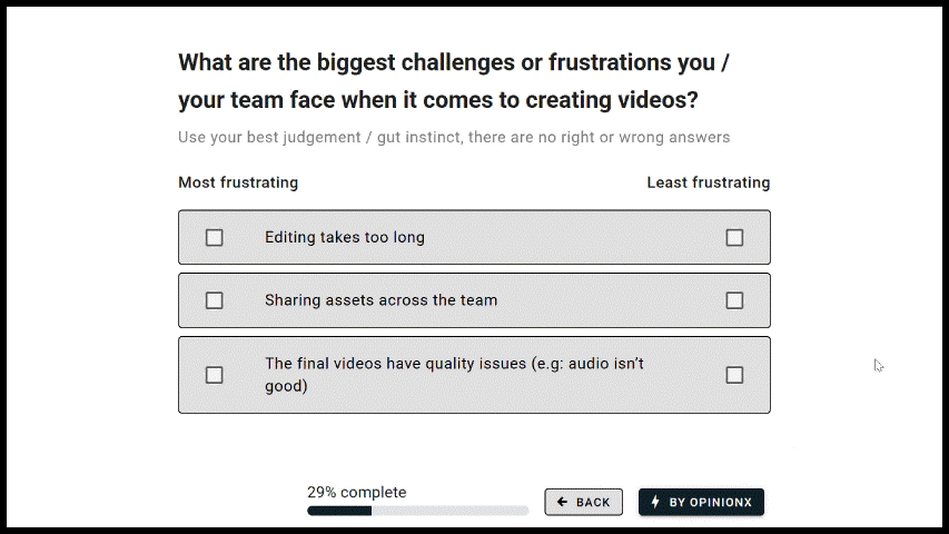 Instead of sacrificing important aspects of her project to make it work on Typeform, Maedhbh searched for a survey platform that was better suited to user research requirements like measuring user needs, ranking VEED’s features by perceived value, and mapping differences by customer segment — which is how she discovered OpinionX.